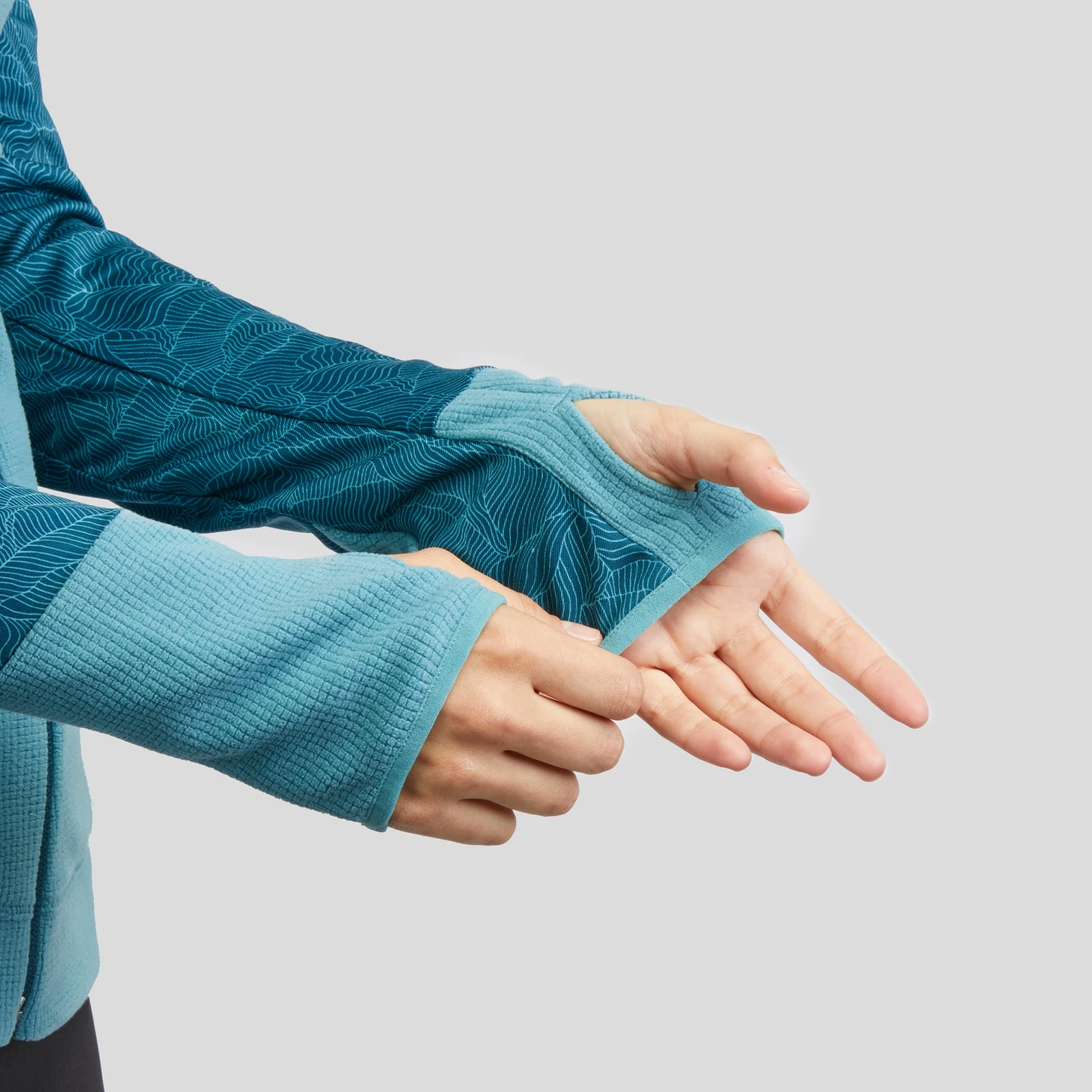 – a “microgrid” material on the chest, back, collar and thumb loop that provides effective protection from the cold like a conventional fleece, but with much greater breathability thanks to its high-tech knit fabric;